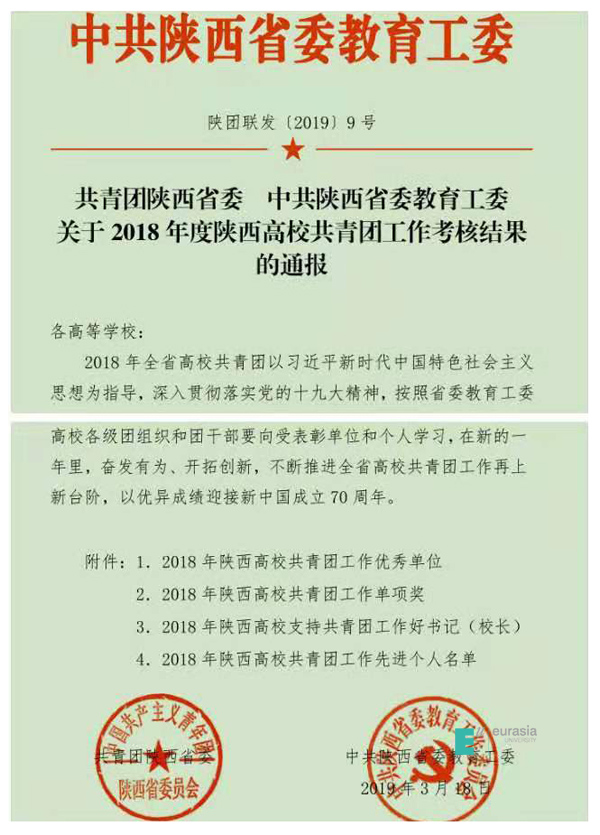 3月18日,共青团陕西省委办公室下发了《关于2018年度陕西高校共青团工作考核结果的通报》(陕团联发[2019]9号),鸭脖团委荣获“新媒体和网络宣传工作先进单位”称号,校党委副书记、校长刘瑾教授荣获“2018年陕西高...