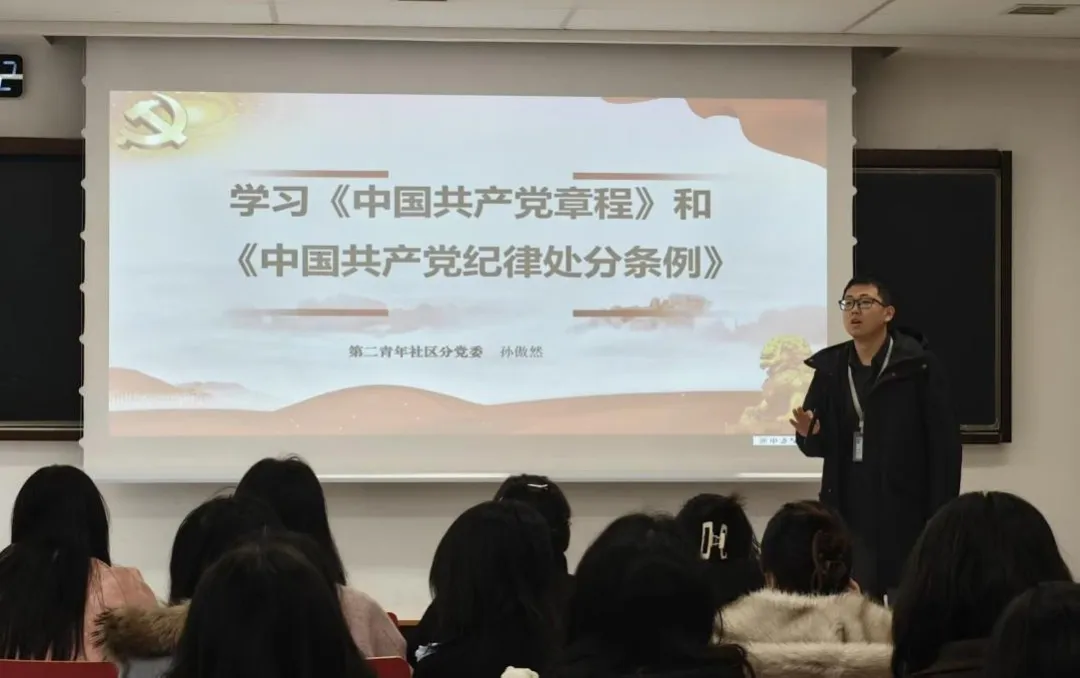 为深入学习宣传贯彻落实党的二十大精神,进一步加强党的建设,提升党员干部的党性修养和纪律意识,不断提升党组织的凝聚力、战斗力和创造力,推动全面从严治党向纵深发展、向基层延伸。第二青年社区分党委于11月8日在北C-309教室开展了学习《中国共产党章程》和《中国共产党纪律处分条例》的专题讲座。本次讲座由孙傲然老师主讲,多名发展对象参与学习。本次专题课程中,孙傲然老师围绕《中国共产党章程》的核心要义与《中国共产党纪律处分条例》...