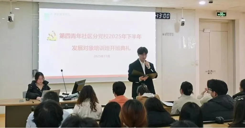 2025年11月11日,第四青年社区分党委在南D-001教室举行2025年下半年发展对象培训班开班典礼,分党委副书记黎舒婷、各学生党支部书记以及62名发展对象出席典礼。开班典礼在庄严的《中华人民共和国国歌》中拉开帷幕,全体师生肃立,齐声高唱国歌。随后,分党委副书记黎舒婷首先宣读了培训管理办法,强调全体学员要充分认识培训的重要意义,严格遵守学习纪律,以高度的政治自觉和饱满的学习热情完成培训任务,在思想和行动上进一步向党组织靠拢,...