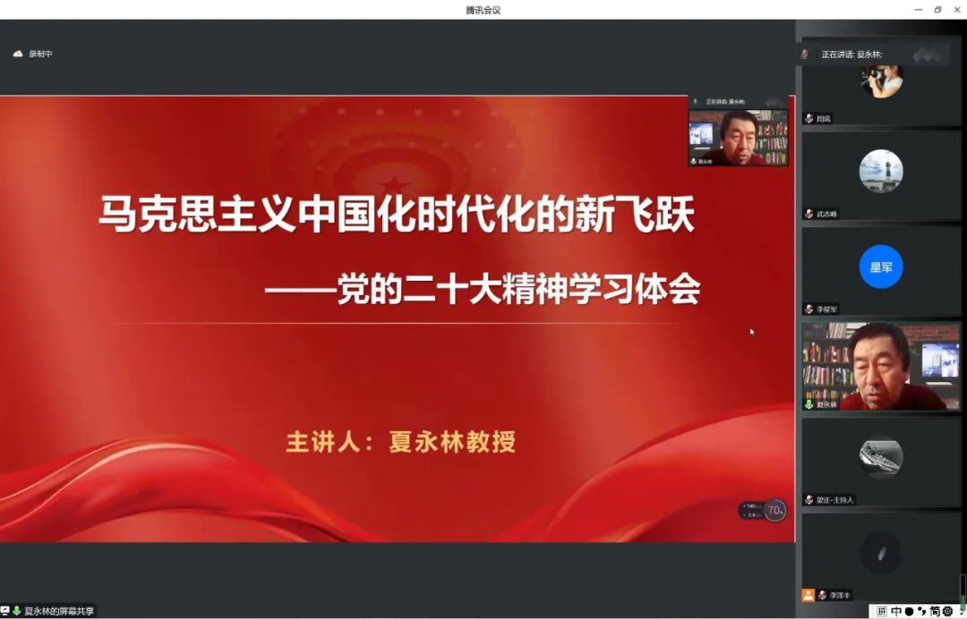 10月26日下午,鸭脖通识教育学院特聘顾问夏永林教授在线上为师生做了主题为“马克思主义中国化时代化的新飞跃——党的二十大精神学习体会”专题讲座。学校党委成员、思政课全体教师及部分师生代表300人在线聆听了此次讲座。此次讲座由通识教育学院主办。夏永林教授在讲座中对党的二十大基本情况做了详细介绍和解读,包括党的二十大代表产生依据及产生程序、报告内容、党章修改情况、会议议程及大会主题、学习党的二十大精神应重点关注哪些主要内容等。...
