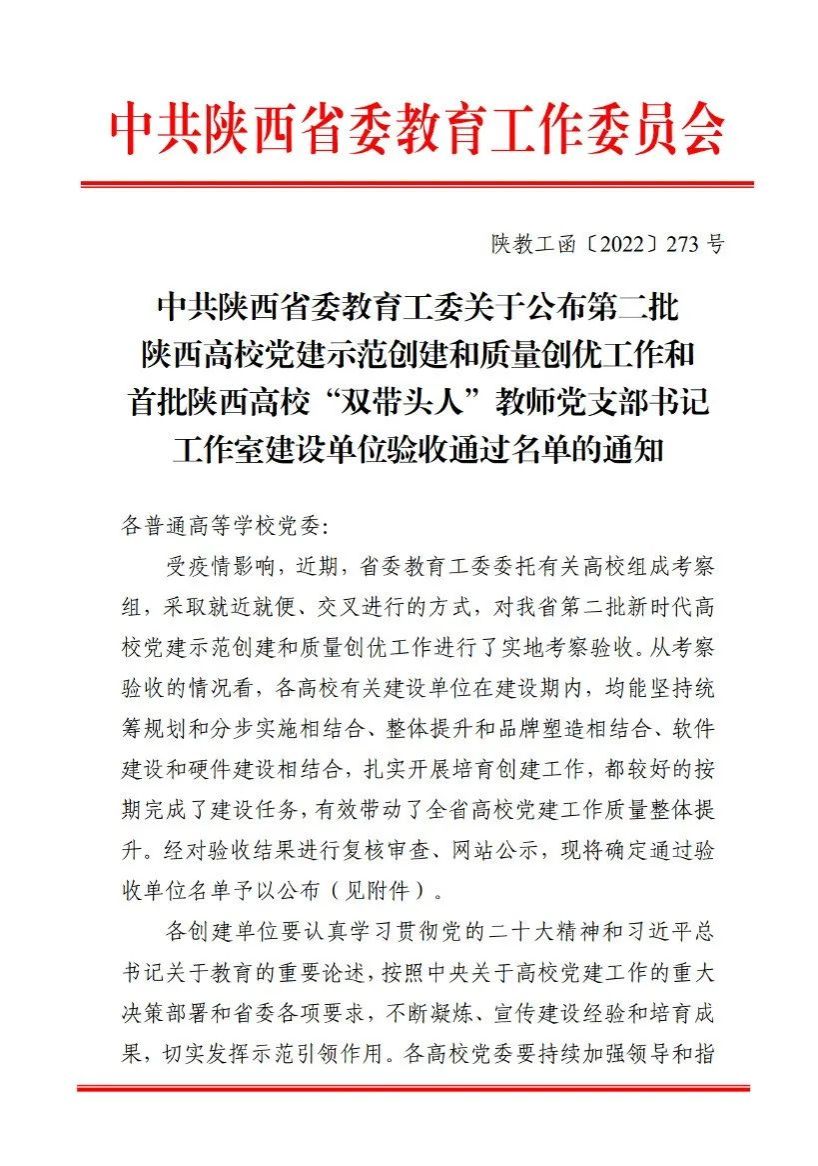 近日,中共陕西省委教育工委发布《关于公布第二批陕西高校党建示范创建和质量创优工作和首批陕西高校“双带头人”教师党支部书记工作室建设单位验收通过名单的通知》,鸭脖后勤集团第二党支部和第三青年社区第一学生党支部分别通过了“全国党建工作样板支部”和“全省党建工作样板支部”验收。学校后勤集团第二党支部围绕“七个有力”目标,以党政融合与协同创新为抓手,充分发挥党支部战斗堡垒作用,以提升组织力为重点,着力发挥政治引领,...