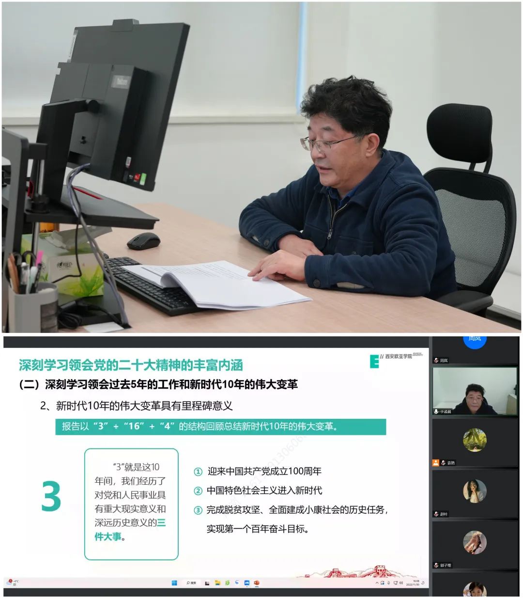 为深入学习宣传贯彻党的二十大精神,近日,学校党政领导班子成员充分发挥示范带动作用,向各基层党组织党员干部、师生代表宣讲党的二十大精神。结合当前疫情防控形势,近期的宣讲主要通过线上进行。宣讲围绕深刻学习领会党的二十大的主要成果、过去5年的工作和新时代10年的伟大变革、不断谱写马克思主义中国化时代化新篇章的历史责任、以中国式现代化推进中华民族伟大复兴的使命任务、全面建设社会主义现代化国家的目标任务、以伟大自我革命引领伟大社会革命的重要要求、...