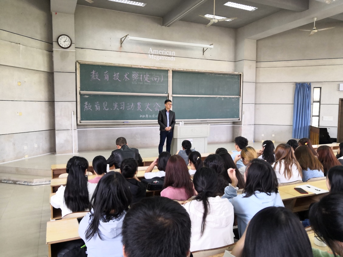 10月23日中午,永利官网组织2018、2019级六年制教育技术学专业全体学生,在润寰南105召开了2020年教育见习及教育实习动员大会。学院副院长何向阳、党总支副书记成夏炎及带队教师祁玉娟、刘琳出席,小学信息技术教育教研室主任黄悦主持大会。