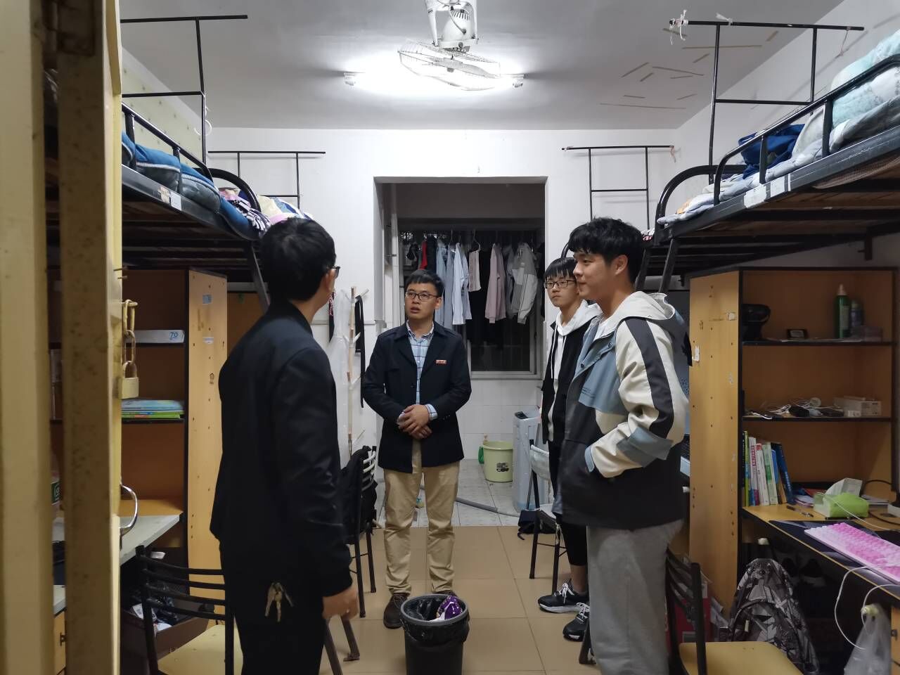 2020年10月27日下午六点整,永利官网党总支书记王杰文教授、副院长田祖伟教授、何向阳教授、党总支副书记成夏炎博士带领辅导员和学生干部到4栋、11栋、12栋、13栋、14栋学生宿舍看望学生,检查寝室学风、文明卫生、内务整理,进行安全隐患排查;详细了解学生近期思想、学习和生活情况,从寝室环境、学习氛围、文明礼仪等方面进行宣传和教育引导。