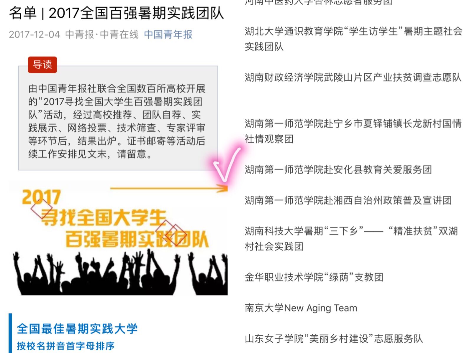 在团中央未来网启动的“奋斗中国梦·实践致青春2017年全国大中专学生暑期‘三下乡’新媒体公益传播力展示活动”中,永利官网三下乡团队“赴安化县‘重走主席游学路’教育关爱服务团”成功入围“优秀团队”、“优秀报道”和“最美中国发现”奖项,学院辅导员唐瑞鸿入围“优秀指导老师”奖项。