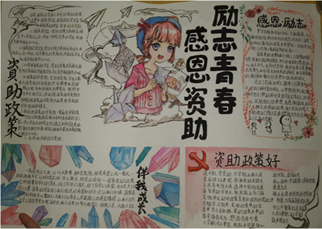 在手抄报的赛场上,共有68名同学参赛。同学们将自己了解的资助政策知识绘制成立意新颖、创意独特的手抄报,用生动的语言和真实的情感表达了个人对资助政策的感悟。通过评委集中评选,共选出18级787教技班汤筱《感恩资助,励志青春》等5幅优秀作品推至校部参与决赛。