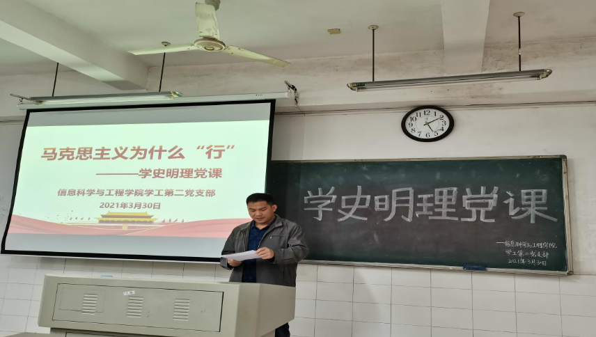 李荣敬通过习近平总书记在纪念马克思诞辰200周年大会的讲话引出了马克思主义为什么“行”,而后分别从马克思主义指引中华民族实现从站起来到富起来的伟大飞跃、从富起来到强起来的伟大飞跃、并实现中华民族伟大复兴的中国梦三个方面带领大家学习了党在马克思主义的指引下走向辉煌的历史,并指出中国共产党是用马克思主义武装起来的政党,马克思主义是中国共产党人理想信念的灵魂。