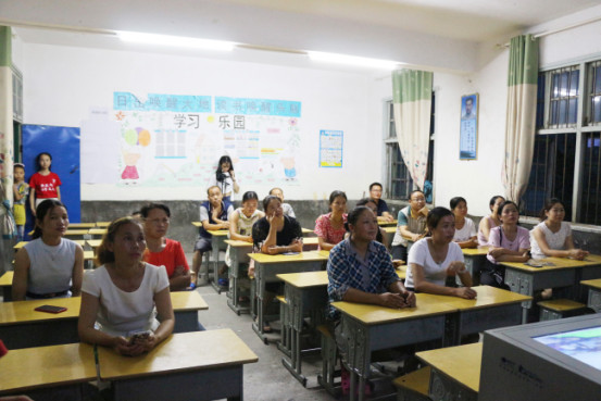 7月15日晚上19点,文明瑶族乡第一片小的一年级教室迎来了一群“特殊”的学生,这些学生有的三十出头,有的两鬓斑白,这些“学生”其实是新航向·梦之队暑期班学生的家长,而这些家长集合的原因是新航向·梦之队开展的成人课堂。