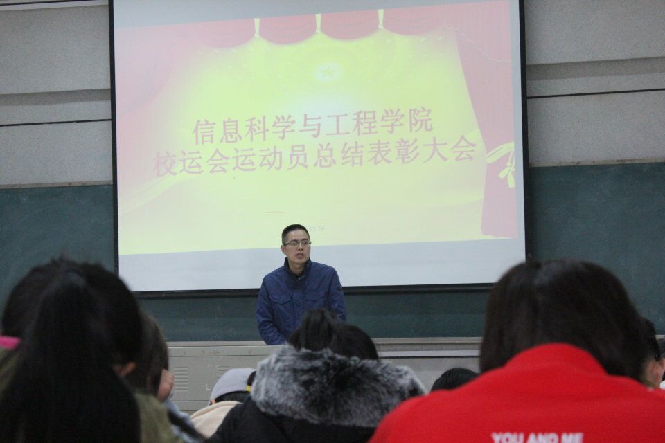 (通讯员 邓力超 陈思迁)为弘扬体育健康精神,加强体育锻炼意识以及嘉奖在此次比赛中辛苦付出的运动员,11月24日中午,信息科学与工程学院在理B-201教室举行了校运会运动员总结表彰大会。副院长田祖伟、党总支副书记罗祥云、学工办李豪杰、唐瑞鸿老师应邀出席本次表彰大会。运动员代表,院团学会全体成员参加此次大会,会议由李豪杰老师主持。