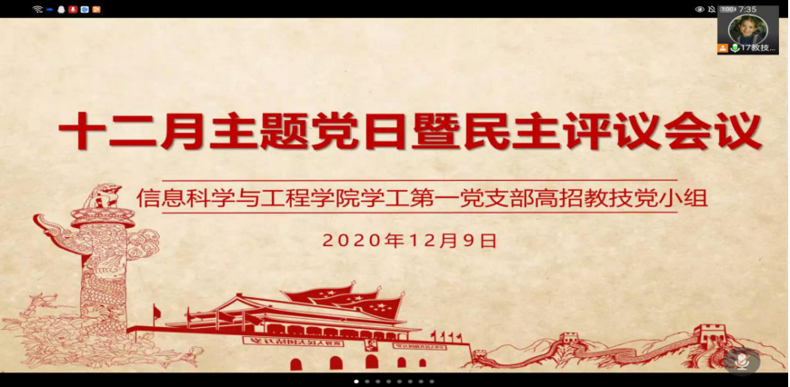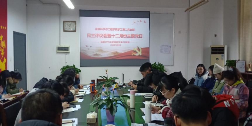 2020年12月9日,信息科学与工程学院学工第一、第二党支部分别采取线上分党小组和线下的方式开展民主评议会暨十二月份主题党日。党总支副书记成夏炎、学工第一党支部书记关红儒、学工第二党支部书记李荣敬以及全体学生党员参加此次大会,由李荣敬、徐世炫、彭紫薇主持大会。