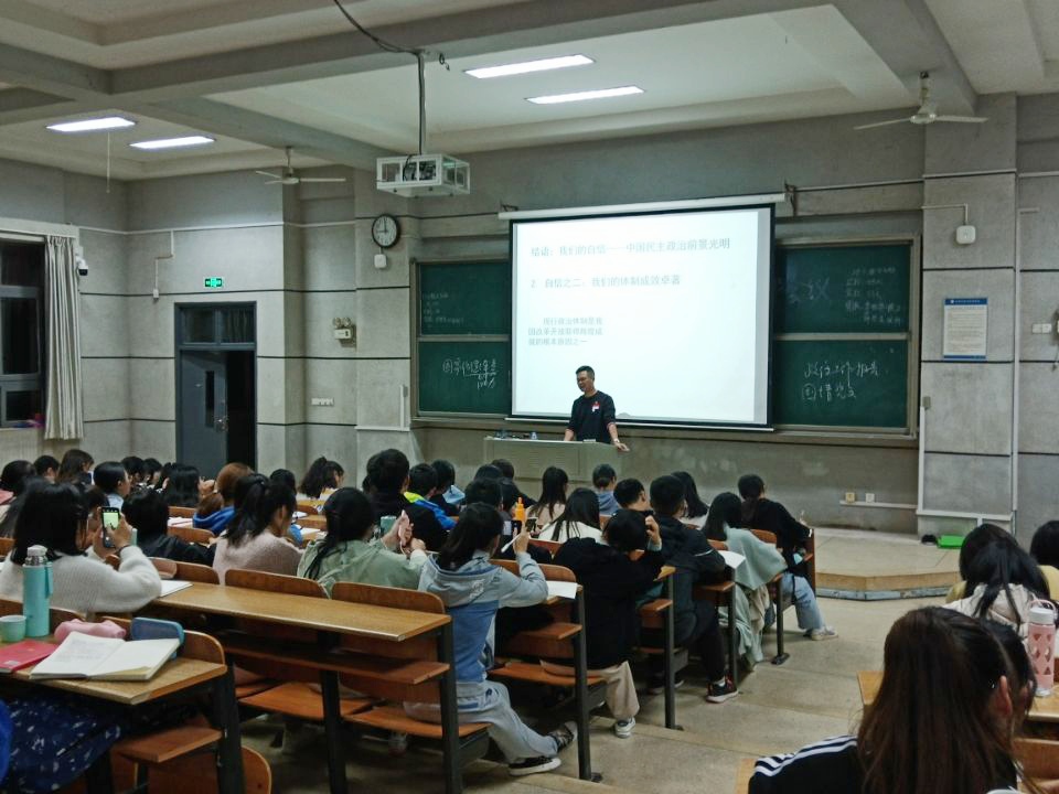 陈老师以“在中西比较中坚定‘四个自信’”为主题,从文化与道路、优势与自信两个方面详尽介绍了“四个自信”的背景、内涵和外延。课上,他结合许多生动的事例,通过中西文化比较、当今国际与国内形势分析,对“四个自信”尤其是文化自信进行了深入解析,为我们讲述了一堂生动的党课。