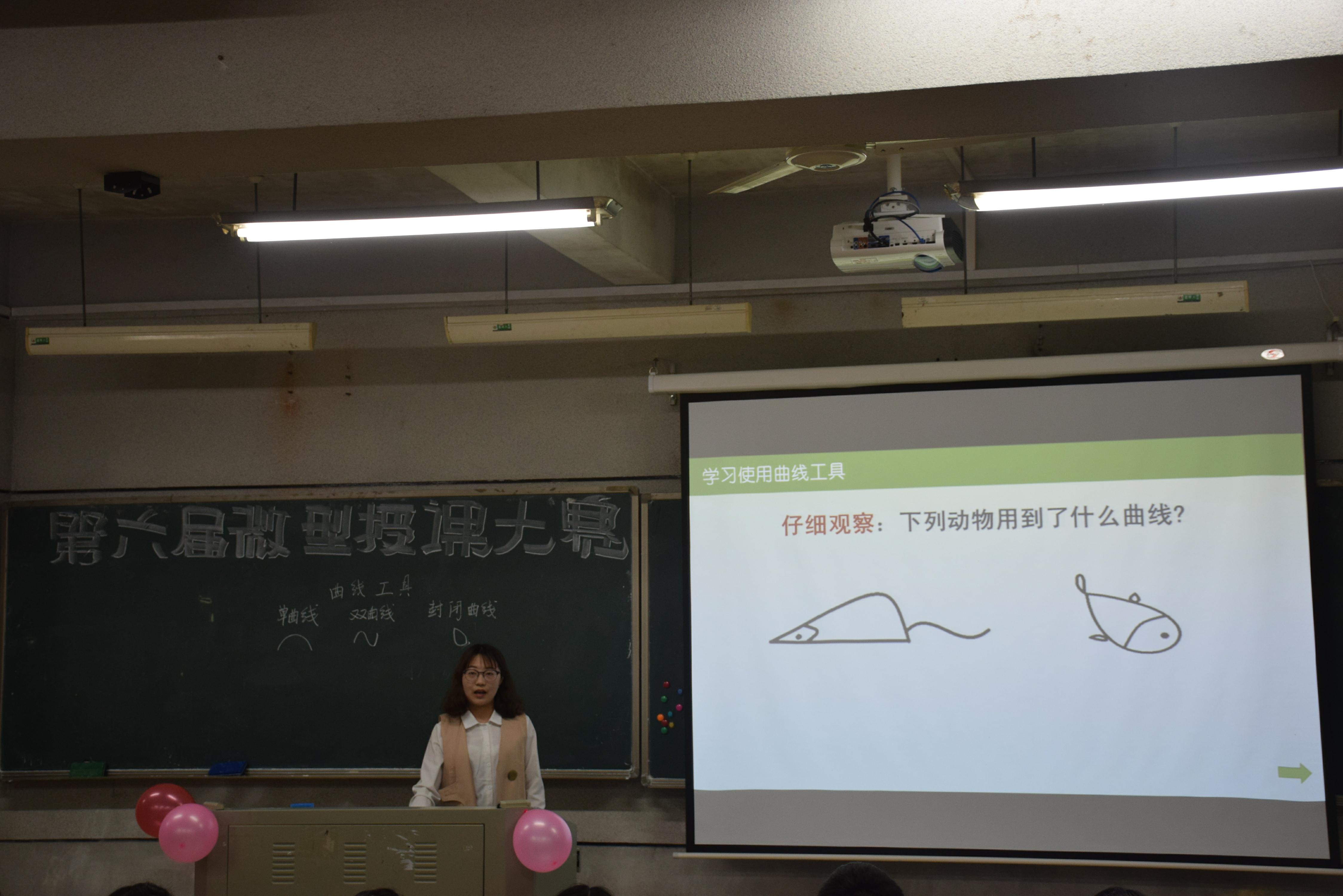 比赛分授课展示、教师基本技能展示及评委提问点评三个环节。经初赛洗礼的16名决赛选手对教学设计、课件制作、教态语言、教学方法等方面把控的更为细腻娴熟。在授课环节中,选手们各显神通,通过“小朋友们”熟悉的动画、故事、音乐等素材巧妙地导入教学内容,不仅调动了学生的学习积极性,也引起了全场观众的共鸣。比如13号选手皮亚芳在“文字的修改”课程教学中以《喜羊羊与灰太狼》的主题曲导入引起全场大合唱,但唱完才发现文字内容有错误,需要修改编辑。4号选手段雅格在教学“曲线工具”时巧妙地将单曲线、双曲线、闭合曲线的画法概括为“拖-拉-击”、“拖-拉-拉”、“点-点-拉”,使得教学内容浅显易懂、清晰明了,赢得了全场观众和评委的一致好评。在教师基本技能环节,选手们也表现不俗。其中10号选手李想的毛笔字、8号选手伏贝的钢笔字、7号选手于烨的粉笔字获得了评委老师的一致好评。