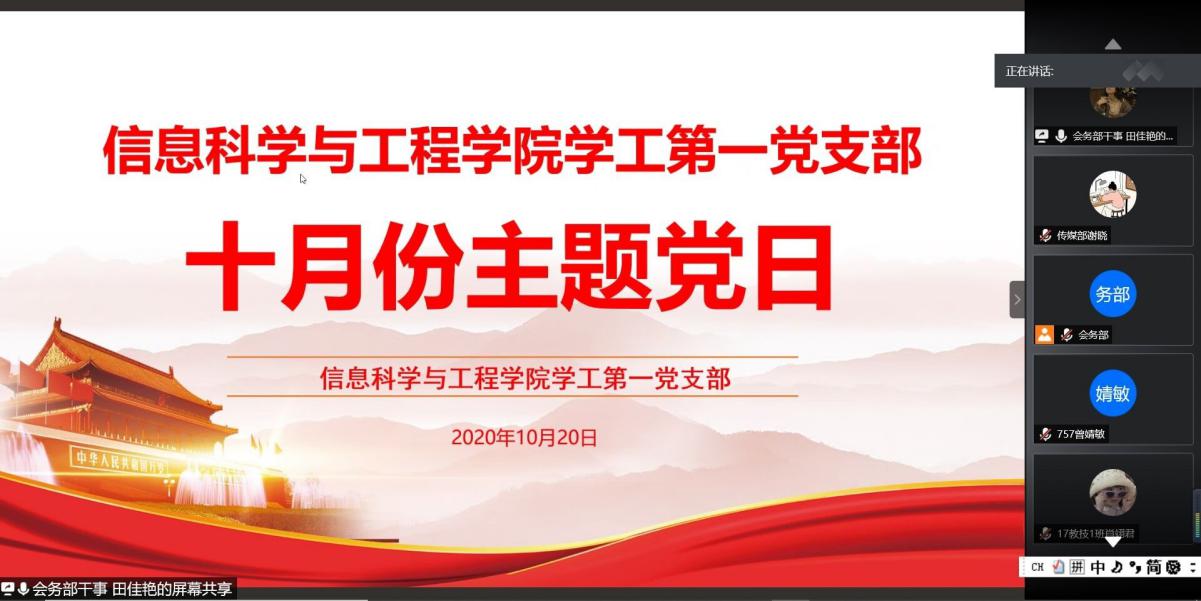 2020年10月20日,永利官网学工第一、第二党支部分别采取线上与线下结合的方式开展主题党日活动,活动由王丹、周应坚主持。永利官网党总支副书记成夏炎、学工第一党支部书记关红儒、学工第二党支部书记李荣敬、学工办老师唐瑞鸿、叶晶以及部分学生党员参加此次活动。