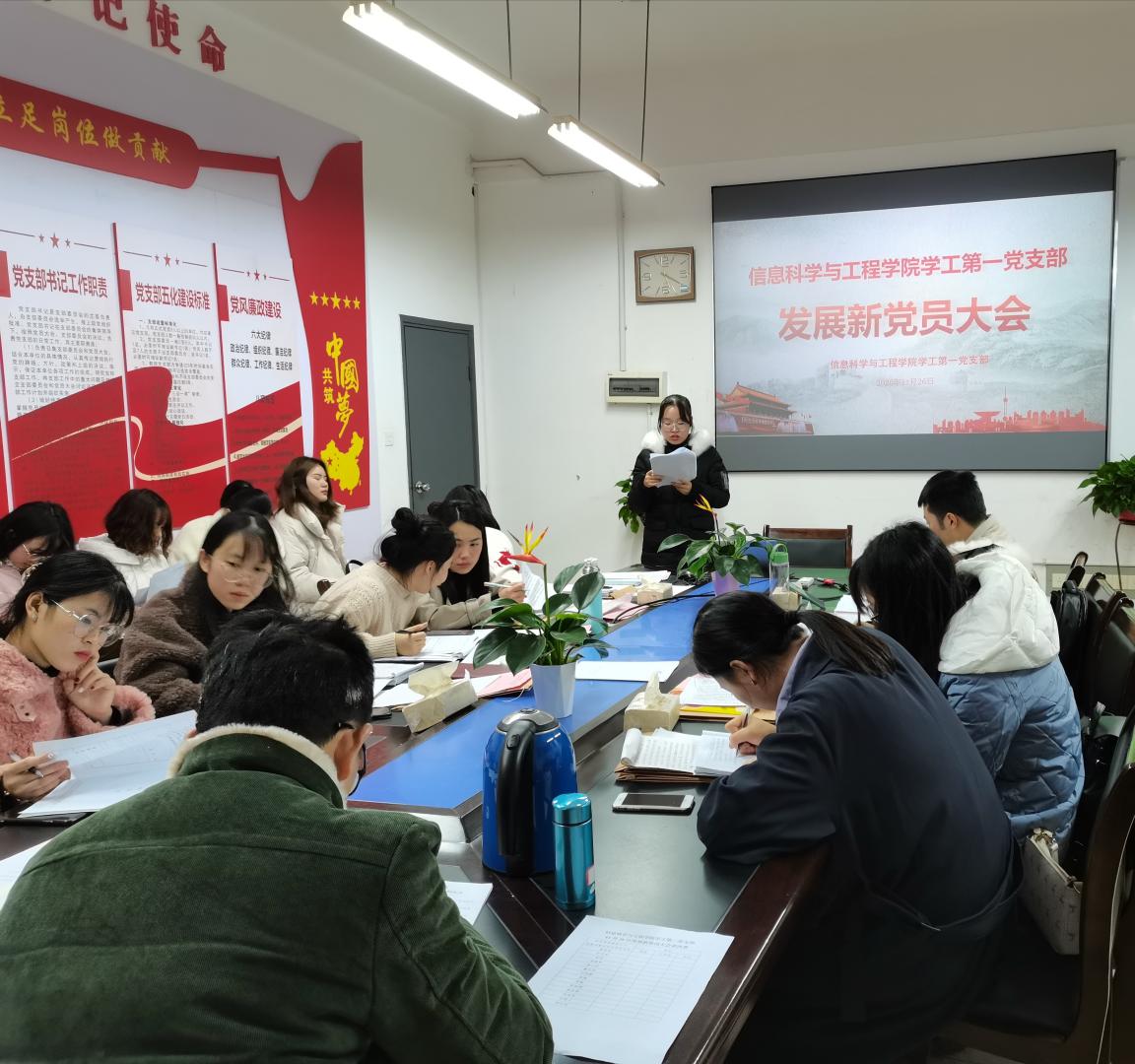 2020年11月26日,信息科学与工程学院学工第一、第二党支部采取线上和线下结合的方式召开本次发展新党员大会。出席此次大会的有学院党总支副书记成夏炎、学工第一党支部书记关红儒、学工第二党支部书记李荣敬、学院团总支书记唐瑞鸿、入党介绍人、两支部的学生党员和拟接收为预备党员的发展对象。会议分别由王丹、李荣敬主持。