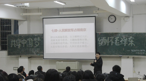 学院党总支副书记成夏炎领诵《七律·人民解放军占领南京》,全体师生深情朗诵主席诗词,感受他笔下的宏伟气概和伟大胸襟,重温那段峥嵘岁月的历史沧桑。我们相信毛泽东诗词所激发出的中国力量一定能够转化为实现中华民族伟大复兴的美好蓝图。