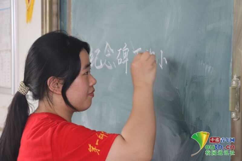 图为队员在长塘仑小学教室黑板上练习板书,为接下来的授课做准备。中国青年网通讯员 段新利 摄