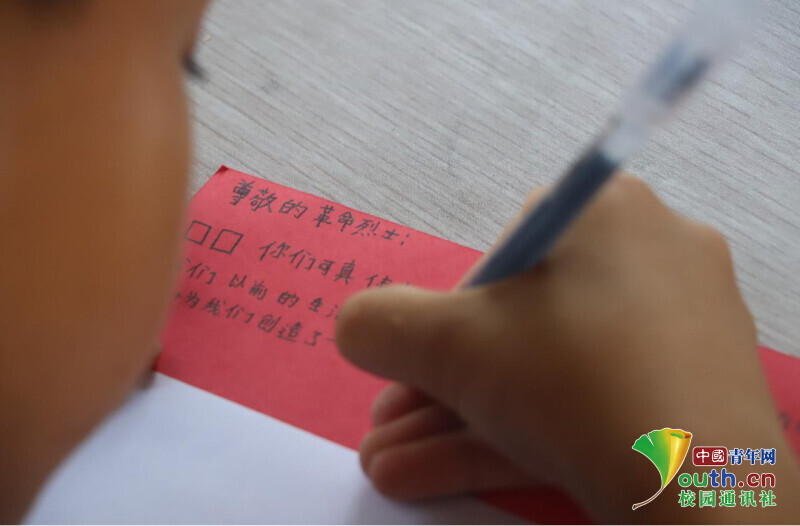 图为学生正在认真的书写送给革命军战士的信,以此表达对革命军战士深深敬意。中国青年网通讯员 段新利 摄