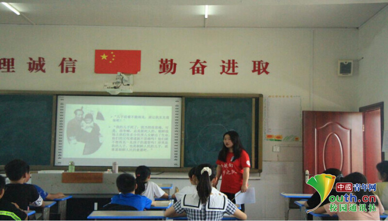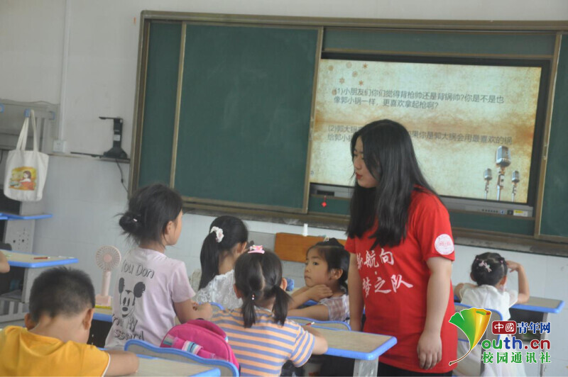 中国青年网益阳7月23日电(通讯员谢卉倩 徐仪婷)2021年7月15日,3044am永利官网信息科学与工程学院新航向·梦之队走进益阳市资阳区迎风桥镇长塘仑小学,与当地政府联合举办“七彩假期”公益暑托班活动。为引导学生树立“感党恩,跟党走”的理想信念,培养学生爱党爱国的情怀。开设了以“学习红色故事,传承红色基因”为主题的故事分享会,在课堂上,学生们表达了对党和国家的热爱和敬佩之情。