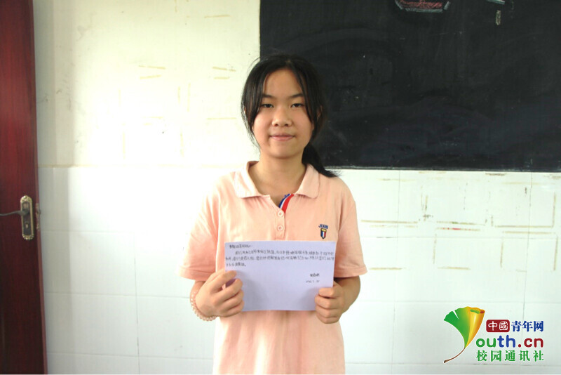 图为一名学生向大家展示自己送给革命战士的一封信。中国青年网通讯员 欧阳健 摄