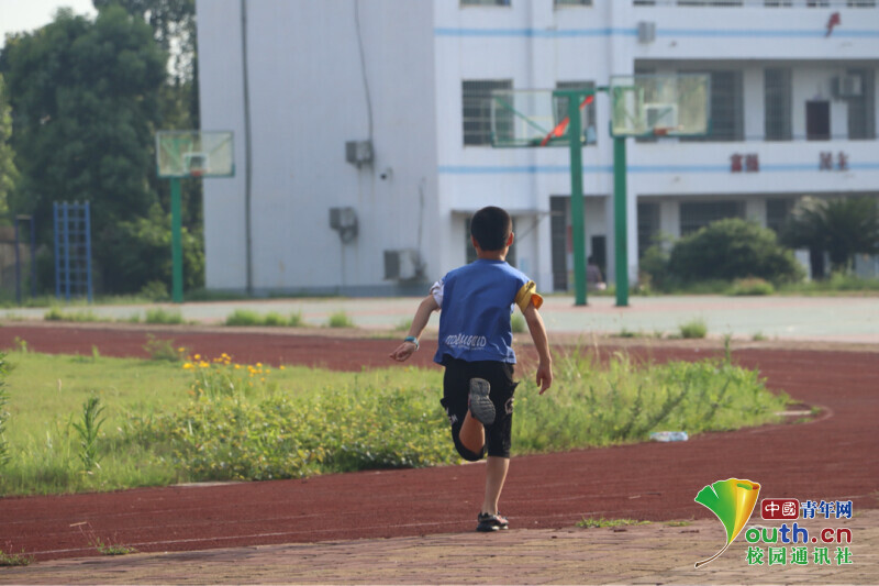 图为“七彩假期”公益暑托班学生得知自己是第一位报到的学生时,开心的满场奔跑。中国青年网通讯员 欧阳健 摄