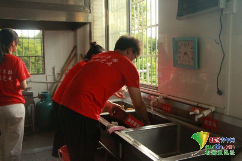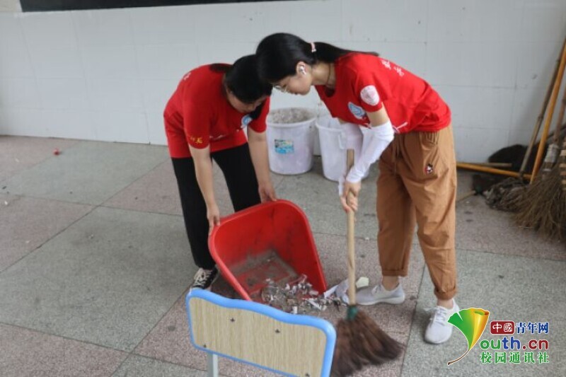 图为志愿者为明日开班仪式迎接孩子打扫卫生。中国青年网通讯员 段新利 摄