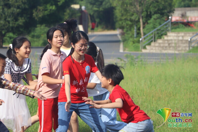 图为体育课上志愿者老师与孩子们一起做游戏。中国青年网通讯员 欧阳健 摄