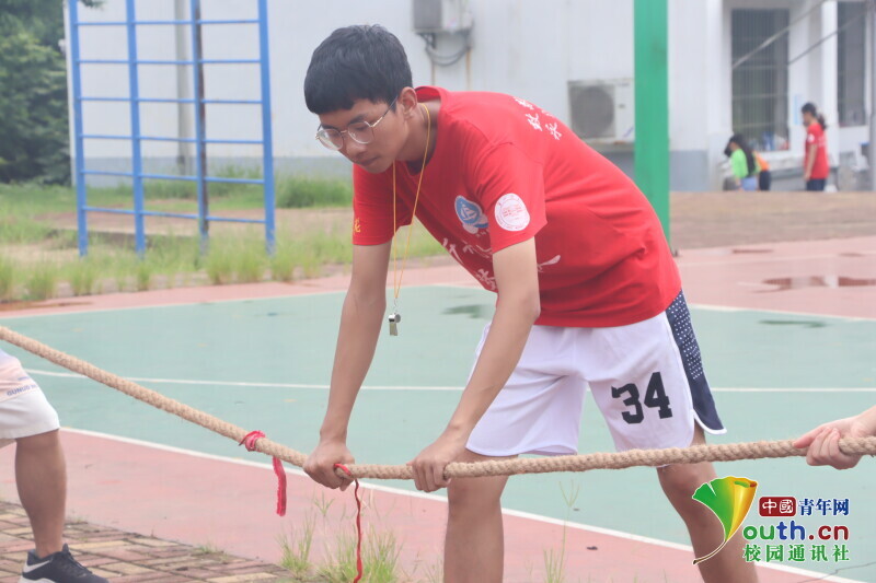 图为在师生共同参与的拔河比赛中,老师和学生们脸憋得通红,拼尽全力拉着绳子。中国青年网通讯员马唯一 摄