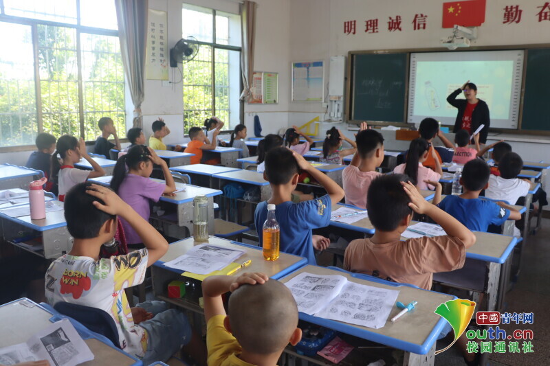 图为英语课上,志愿者老师在教学生如何将抽象的单词具体化,拍头表示头的单词。中国青年网通讯员 段新利 摄