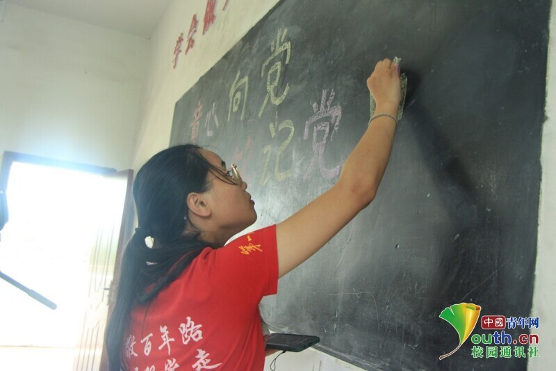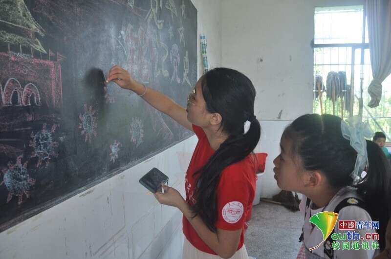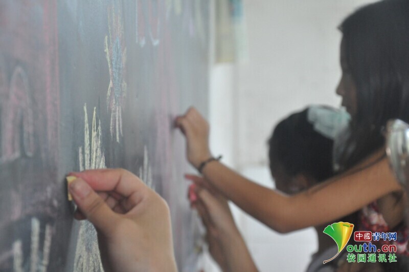 图为向日葵班班主任用彩色粉笔书写粉笔画的主题,打算用白色粉笔小心勾勒出轮廓。中国青年网通讯员 欧阳健 摄