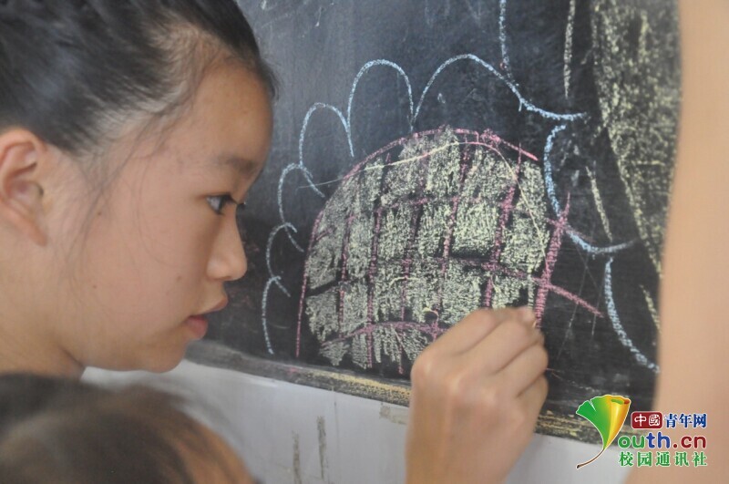 图为老师正在给孩子示范向日葵用粉笔应该怎么画,粉笔画让孩子的眼里充满了好奇。中国青年网通讯员 欧阳健 摄