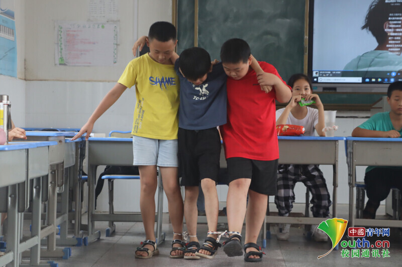 图为新航向·梦之队志愿者与孩子们进行喊数抱团游戏,锻炼学生的数学能力和团结协作能力。中国青年网通讯员 何星逸 摄