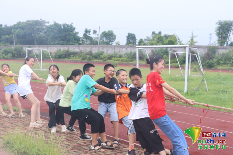 图为新航向·梦之队志愿者和学生们用尽全力在拔河,渴望获得游戏的胜利。中国青年网通讯员 何星逸 摄
