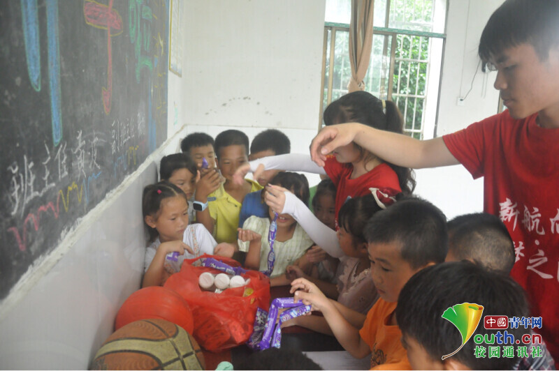 图为新航向·梦之队志愿者为孩子们分发运动会的奖励,同学们都高兴的来领取奖品的场景。中国青年网通讯员 何星逸 摄