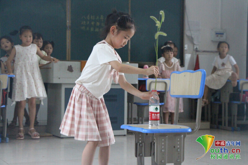 图为迎风桥镇长塘仑小学学生正在进行游戏插花接力游戏,锻炼学生的整体协作能力。中国青年网通讯员 何星逸 摄