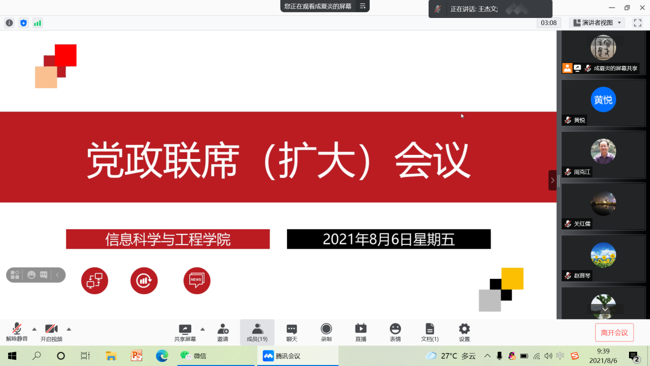 8月6日上午,永利官网通过腾讯会议平台召开党了政联席(扩大)会议。会议由党总支书记王杰文主持,学院领导及班子成员、党总支组织员、三办主任、党支部书记、教研室主任及实验室主任参加。