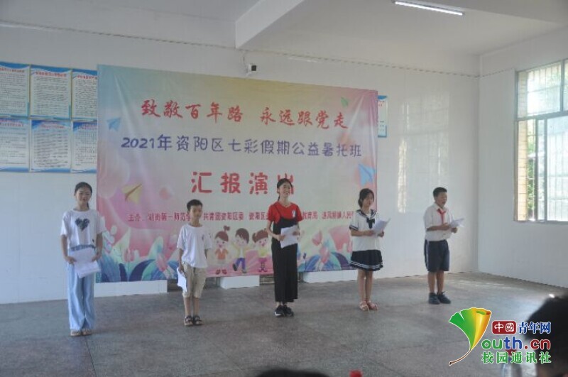 图为七彩假期公益暑托班汇报演出的五位主持人正在宣读开场词。中国青年网通讯员 马唯一 摄