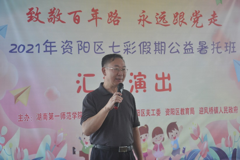 7月23日上午,由永利官网“三下乡”社会实践团举办的“致敬百年路,永远跟党走”文艺汇演在长塘仑小学举行。莅临演出现场的领导和嘉宾有迎风桥镇党委书记谭莹,镇党委副书记、镇长肖博,团区委书记曾晴阳,迎风桥镇中心学校校长罗立强,长塘仑小学校长黄小毛,学院党总支书记王杰文,副书记成夏炎,党总支委员、副院长田祖伟,副院长何向阳,党总支委员、学工办主任关红儒,团总支书记、团队带队老师李荣敬。