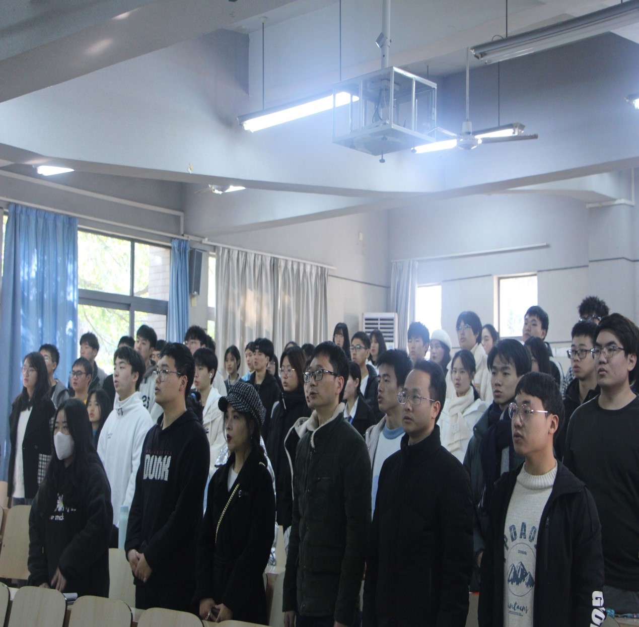 大会第五项,全体起立,奏《3044am永利官网校歌》,活动结束,合影留念。