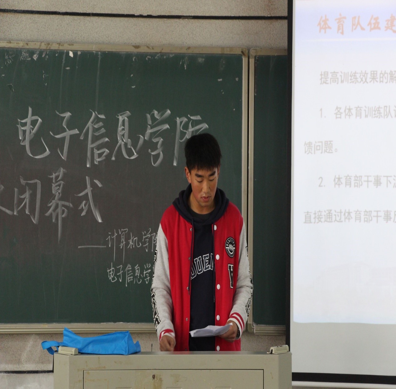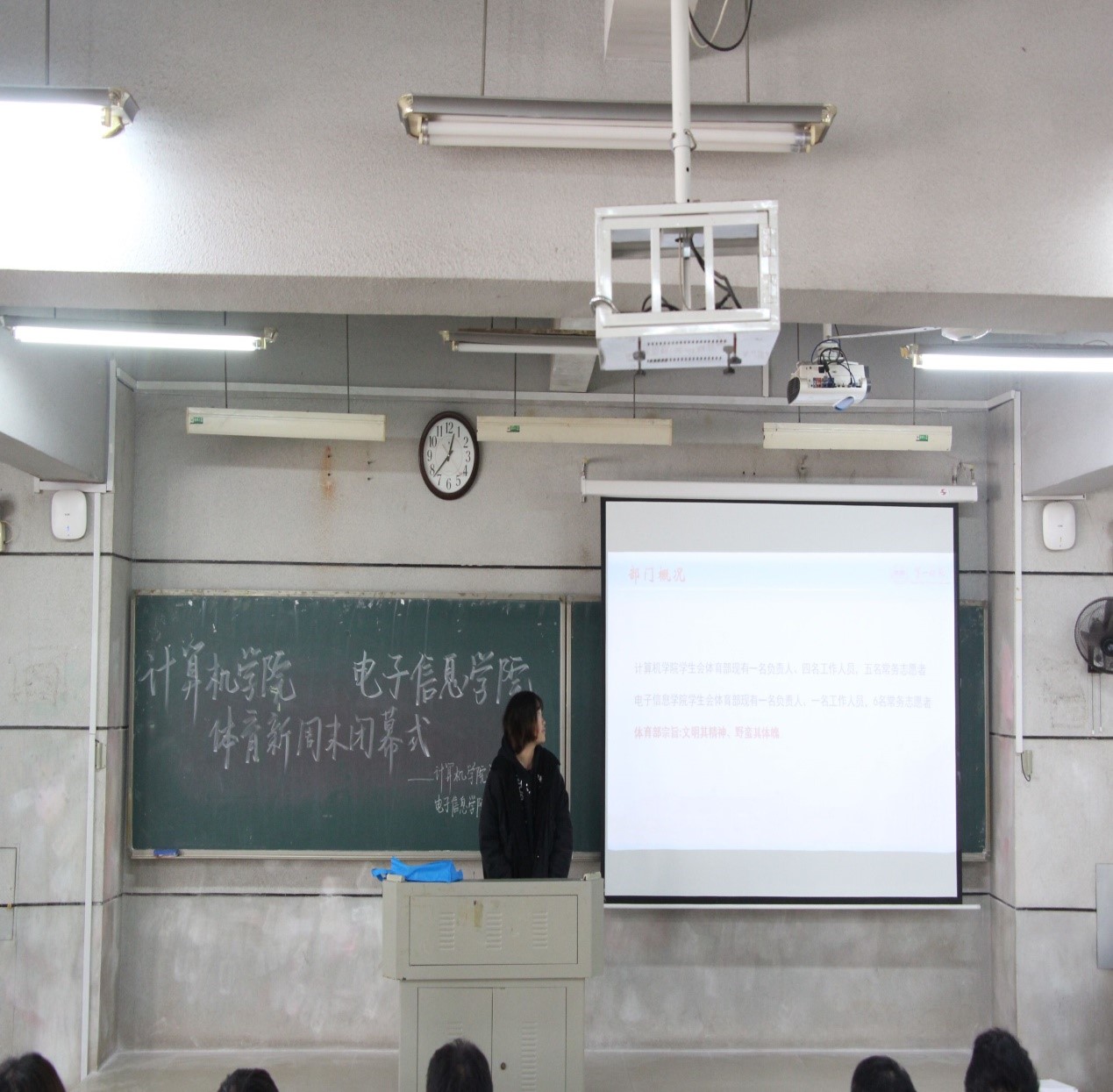 12月21日中午12:30,永利官网领导老师、核心干部和各班体委以及参赛人员齐聚于润寰南101一同开展了永利3044noc与电子信息学院“体育新周末”闭幕式。本次闭幕式由邓戬主持。