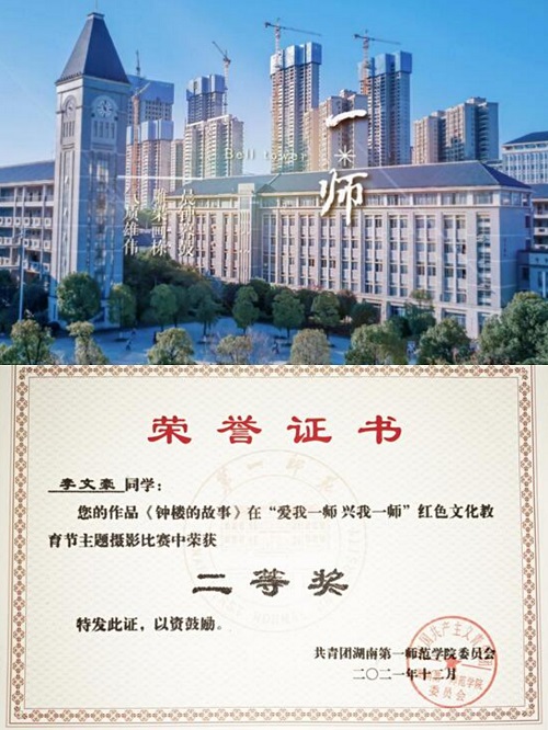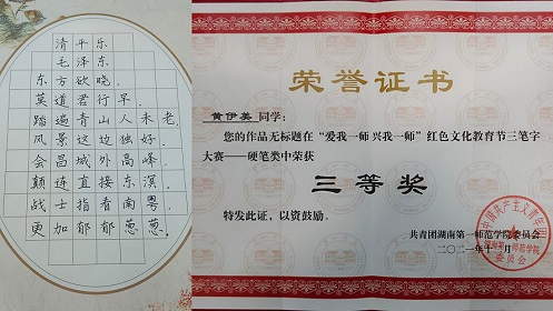 此次红色文化教育节还包括三笔字比赛、征文比赛、摄影比赛。获奖优秀作品在颁奖典礼现场陈列展出。永利官网19级818教技班李文豪的摄影二等奖作品《钟楼的故事》,20级848教技班黄伊美的三笔字(硬笔)比赛三等奖作品《清平乐》陈列其中。