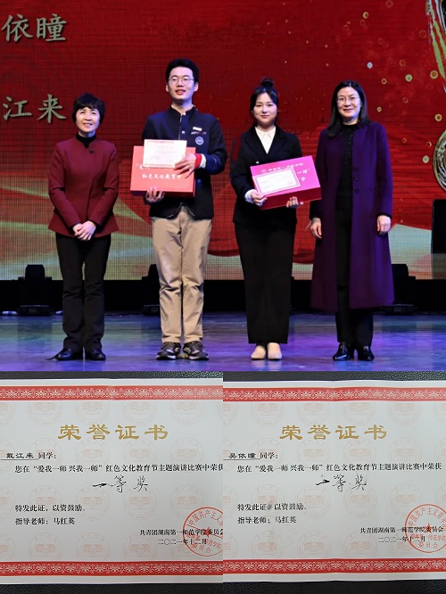 12月25日下午,3044am永利官网“赓续红色血脉·爱我兴我一师”红色文化教育节演讲比赛决赛暨颁奖典礼在田汉剧场举行。永利官网学子喜获佳绩,由马红英老师指导的21级881教技班戴江来和21级882教技班吴依瞳在演讲决赛中突出重围斩获最高奖项一等奖。