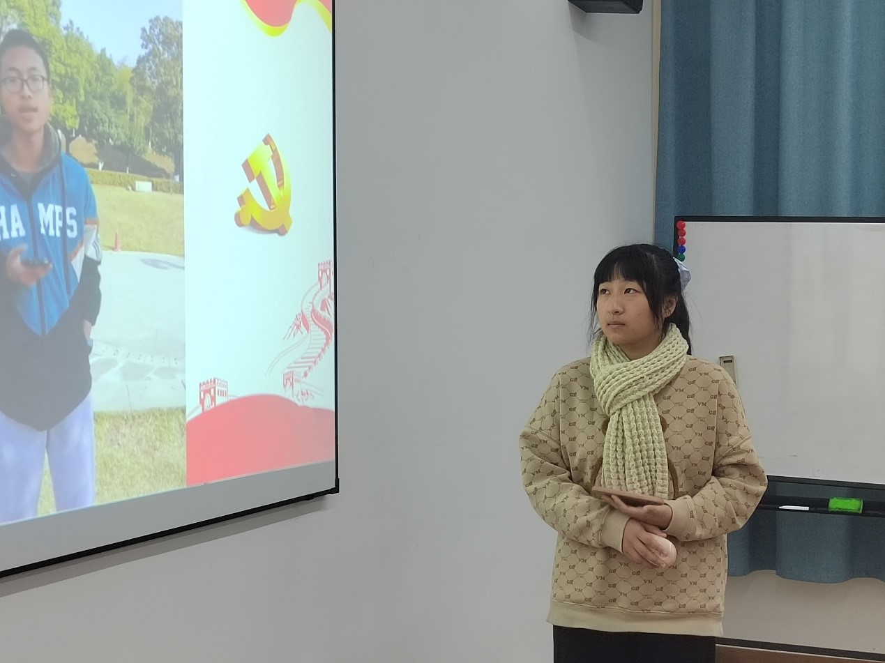 学生党员谢晓通过毛主席旷达豪迈的经典诗词分析出其艰苦朴素、严于律己、波澜壮阔、豪情万丈的形象,来向同学们心目中永远的毛主席致敬并激励同学们不忘来时路,勇敢向前行。