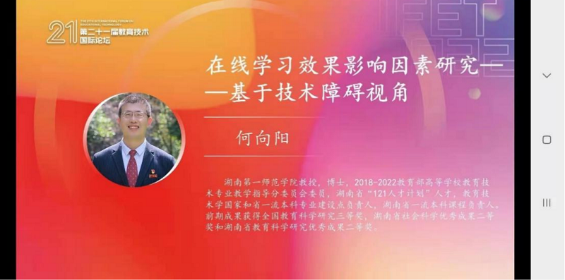11月19日至11月20日,第21届教育技术国际论坛(IFET2022)在沈阳师范大学召开。永利官网何向阳教授受邀在嘉宾学者论坛做题为“在线学习效果影响因素研究——基于技术障碍视角”的学术报告。