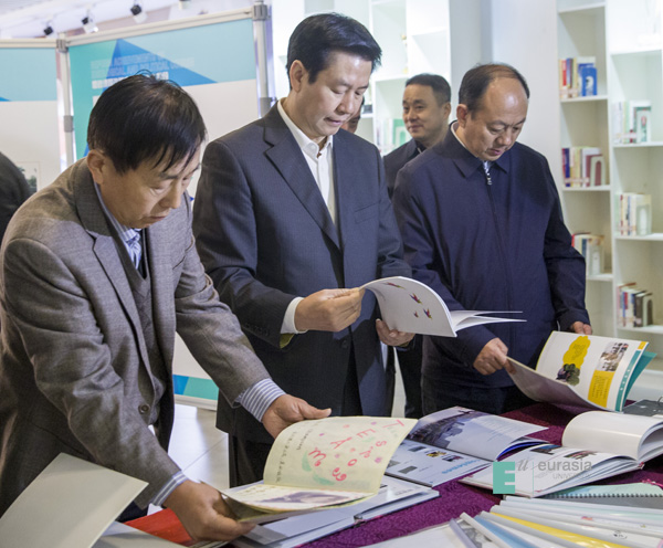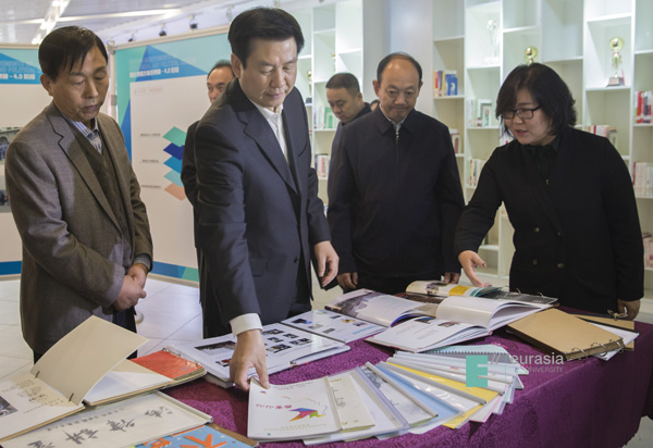 (图三)陕西省委常委、宣传部部长庄长兴与省委高教工委书记董小龙共同检查欧亚学院“四位一体”思政课改革学生作品