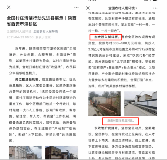 王瑛带领的团队为赵庄村进行乡村面貌改造与环境治理,在“全国村庄清洁行动先进区县评比”中获得殊荣,并受到《农民日报》公众号——“全国农村人居环境”的表扬与肯定。