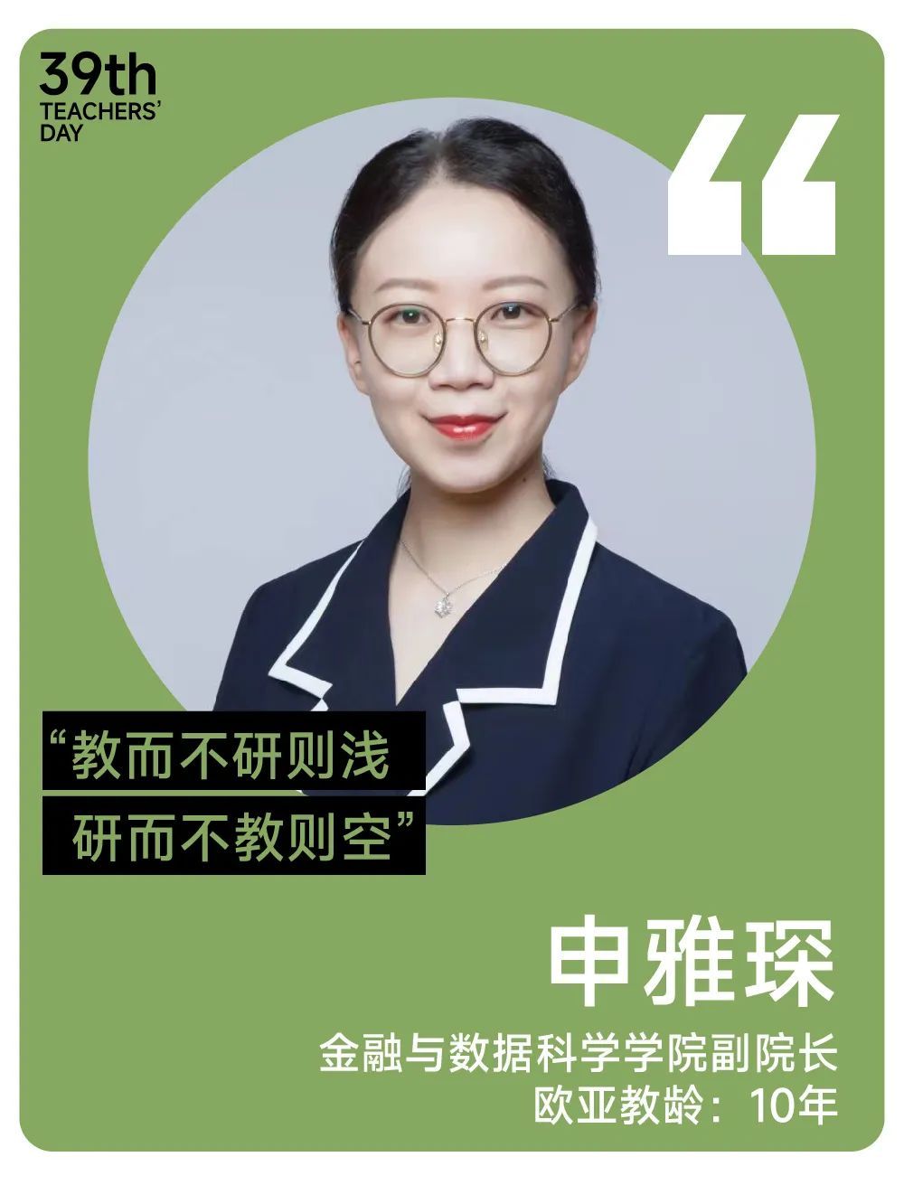 在众多职业中,“教师”一职令申雅琛最为神往。“相较于其他职业,教师需要一直保持输入与输出的状态,这种源源不断的知识吸收、探索与转化令我感到快乐与成就。”怀揣着强烈的知识热忱与教育向往,申雅琛选择入职欧亚,今年她迎来了在欧亚度过的第十个教师节。