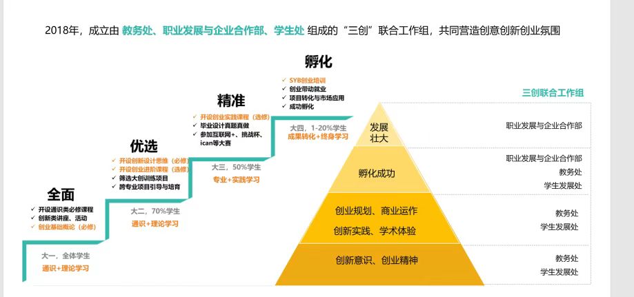 同时,学校逐步完善创新创业课程体系,将创新思维、创业意识、创业技能三大类课程,分层覆盖至大一到大四的全体学生,让启发式的创新创业教育真正嵌入到教学体系中。