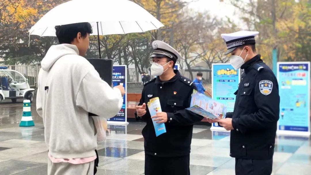 西安市公安局交通警察支队雁塔大队安监中队张文礼警官等一行4人也来到活动现场,两边竖立了“雁塔大队交通安全主题宣传”展示牌,倡导大家遵守交通法规等。活动现场向师生发送有关行人安全常识、骑车安全知识、摒弃六大交通陋习、倡导六大文明交通行为等宣传资料。