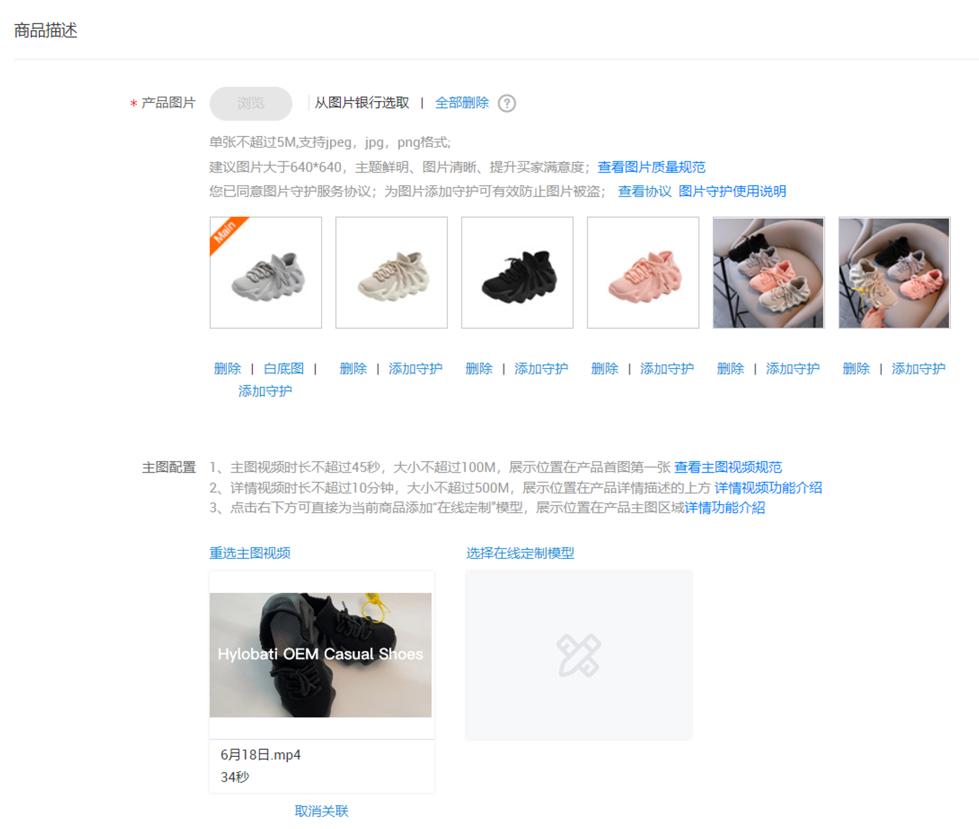 商品描述中主要是产品主图和主图视频的上传,主图视频能够给予消费者更多产品细节信息,利于提升曝光和点击率。主图视频也分为低质、普通、优质三个等级。其中,视频清晰度、视频时长控制在45秒左右、添加轻音乐作为背景音乐、录制真人讲解和三条以上的英文字幕,是优质视频的必要条件,且对于国际站平台来说,非中文歌词或中文人声且有歌词的音乐易牵扯到版权问题,容易被判定为低质量视频。