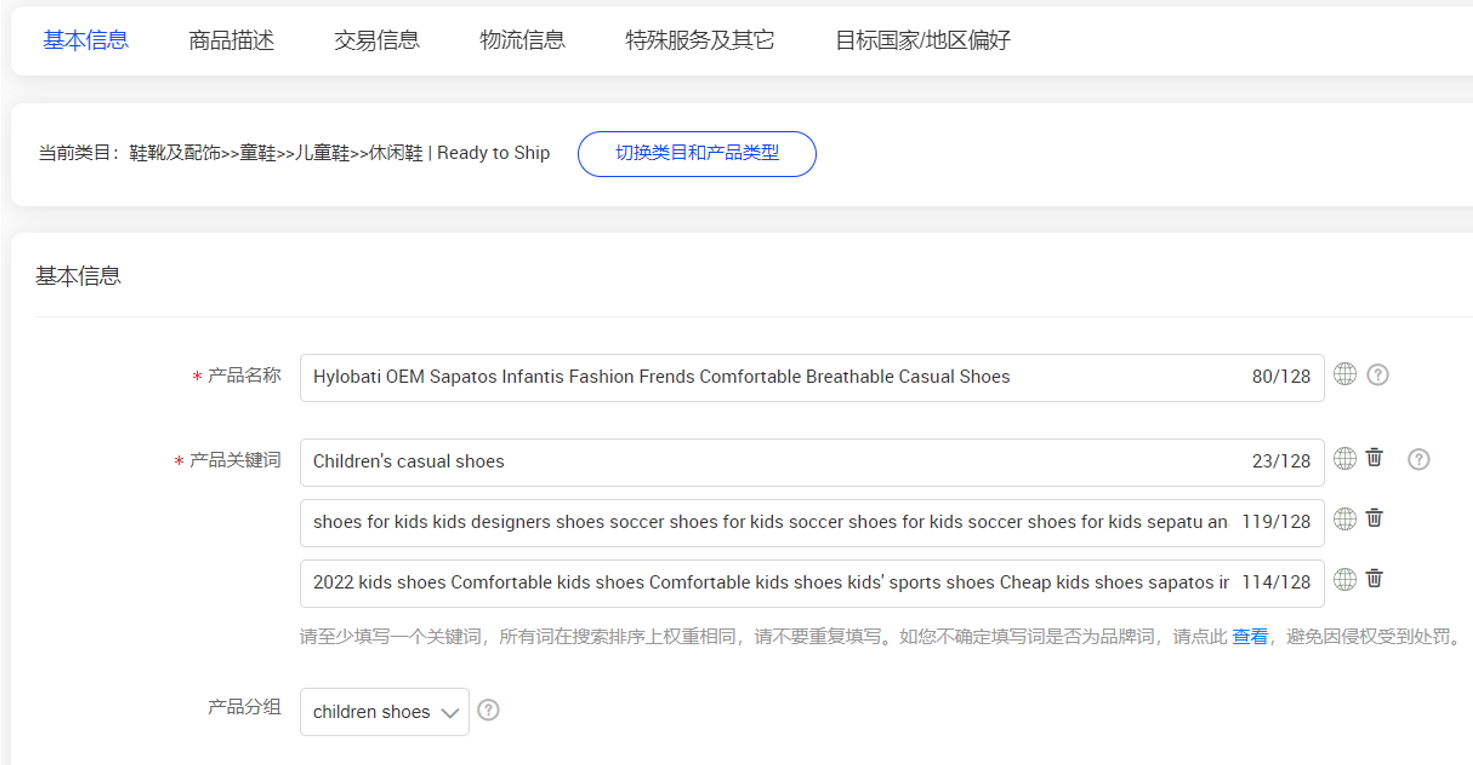 产品信息环节中主要涉及产品名称和关键词的填写,首先要确定产品的核心词,它代表了商品的核心属性。在确定核心词后还需要对产品名称进行扩展来覆盖更多来自客户的搜索。在店铺后台中可以通过数据分析中的关键词分析来确定产品名称扩展词和产品关键词。